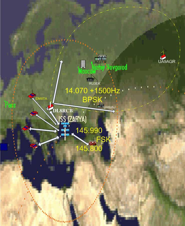 На картинке видна передача цифровой информации из УКВ APRS сети Европы на КВ диапазон в участке 14070 кГц BPSK со смещением 1500 кГц. Слева в окне программы PSK31srv видна информация APRS пакетов, которая полноценно отображается в окне UIVIEW32 справа. Получение практического результата подсказало следующий шаг: а почему бы не попробовать передать цифровую информацию, поступающую с Международной космической станции (МКС-ISS), тем более, что она поддерживает APRS в режиме Paсket? Ниже Вы видите условную структуру приема и передачи цифровой информации с наземного комплекса DL8RCB Сигнал с пролетающей над Европой МКС принимается на частоте 145.800 KHz 1200 baud и после его обработки программой UIVIEW32 через коротковолновый канал передается на частоте 14070 KHz + 1500 Hz программой PSK31srv в режиме BPSK.  В результате появилась возможность всем желающим фиксировать момент входа МКС в зону радиовидимости Европы видеть трафик её работы приготовится к проведению QSO с новыми станциями, активными на данный момент для тех, кто через неё работает