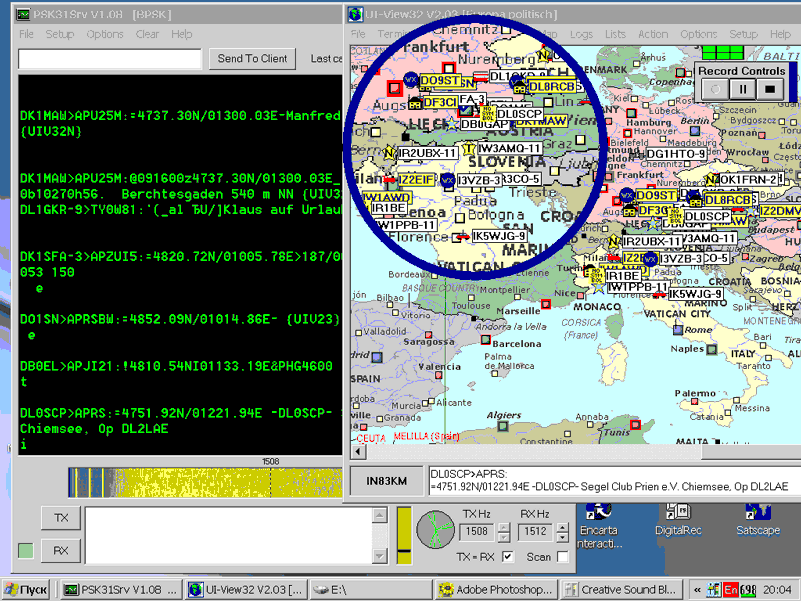 Продолжая тестировать утилиту /PSK31 serv/ для программы UIVIEW32, мы неожиданно увидели вариант практического использования передачи информации из Европейской сети APRS (UHF 144.800 кГц) в используемый для работы на КВ PSK участок 14070 кГц . Так как утилита PSK31serv, написанная специально для программы UIVIEW32, позволяет работать в PSK31, вероятность получения достоверной информации на КВ возрастает. Для приема можно использовать любую программу для PSK31. Мы использовали популярную программу MiX Win mode BPSK, которая в "связке" с UIVIEW32 в режиме Packet дает хорошие результаты. Вначале попробовали работать BPSK и QPSK в сети APRS станций. Этот вариант показал себя как полноценный APRS канал, в котором реализованы все виды взаимодействий. К тому же у программы PSK31srv есть функция авто и ручного захвата координатной информации из трафика станций, работающих PSK, что позволяет использовать её и вне пакетной сети. Далее возникла мысль передачи APRS Европейского трафика УКВ на КВ.