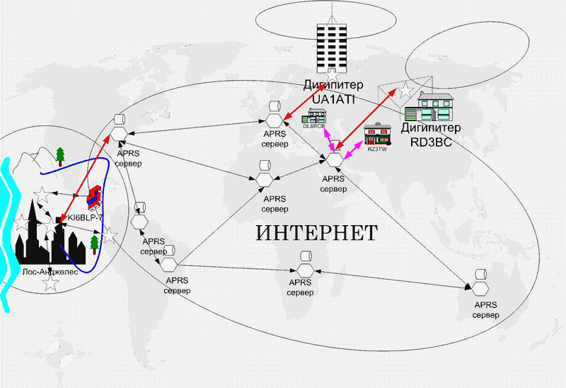 Развитие APRS и России невозможно без изучения опыта, накопленного радиолюбителями в других странах. Сегодня при наличии ИНТЕРНЕТ можно полноценно воспользоваться как опытом, так и уже функционирующими APRS ресурсами ИНТЕРНЕТа, чтобы уже сейчас использовать у нас эти возможности. 20 февраля 2006 г. Володя KI6BLP собрался в калифорнийские горы покататься на лыжах и предложил всем желающим совершить с ним эту поездку виртуально. Это и позволило ближе познакомится с действующей сетью APRS Лос-Анджелеса и его пригородов и убедится в работоспособности мировых радиолюбительских ИНТЕРНЕТ структур и их применимости у нас. Не имея прямых APRS каналов с Калифорнией, в этой ситуации пришлось рассчитывать только на ИНТЕРНЕТ или на шлюзы ИНТЕРНЕТ - КВ, ИНТЕРНЕТ - УКВ. Информационная структура системы в этом случае выглядит следующим образом: