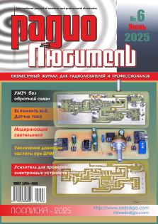 КОЛОНКА РЕДАКТОРА 2 Путеводитель по подписке на журнал “Радиолюбитель” ГОРИЗОНТЫ ТЕХНИКИ 3 Новости от C·NEWS АУДИОТЕХНИКА 8 Вячеслав Баринов. УМЗЧ без обратной связи 9 Алексей Браницкий. Электронная концертина АВТОЛЮБИТЕЛЮ Понятия. Основы автозвуковой науки, опыты и эксперименты 13 Андрей Елютин. Вспомнить всё АВТОМАТИКА 18 Николай Хлюпин (RA4NAL). Модернизация светодиодного светильника 20 Александр Алексеев (R2AUK). О работе пультов и радиомодулей на 433 МГц ИЗМЕРЕНИЯ 23 Олег Белоусов. Схема генератора формирования сигнала синуса 24 Леонид Ридико. Интерполирующий частотомер FC-510 ИСТОЧНИКИ ПИТАНИЯ 26 Роман Абраш. Датчик тока для инвертора напряжения ИНФОРМАЦИОННЫЕ ТЕХНОЛОГИИ 28 Александр Алексеев (R2AUK). Микроконтроллеры STM32: используем тюнер и клавиатуру в своих проектах РАДИОПРИЕМ 31 Александр Берёзкин (UA1AEB). “Радиовещание на русском языке” “РЛ” - НАЧИНАЮЩИМ 32 Андрей Савченко. Универсальный усилитель для проверки электронных устройств 35 Александр Алексеев (R2AUK). Начало работы с LimeSDR, Gqrx и GNU Radio РАДИОСВЯЗЬ 38 Виктор Беседин (UA9LAQ). Увеличение девиации частоты при ШЧМ с кварцевыми резонаторами в КЗГ 42 Регенеративный приёмник 3,5-24 МГц для любительских диапазонов ТЕХНОЛОГИИ 44 Александр Алексеев (R2AUK). Краткий обзор дешевого USB-микроскопа 45 Владимир Мельник. Почти вечный фонарик КНИЖНАЯ ЛАВКА РНТБ 46 Источники питания ВЫСТАВКИ РНТБ 47 Осторожно, нас окружает среда 47 Стандарты в области рыбоводства и рыболовства48 “РЛ” - ИНФО |